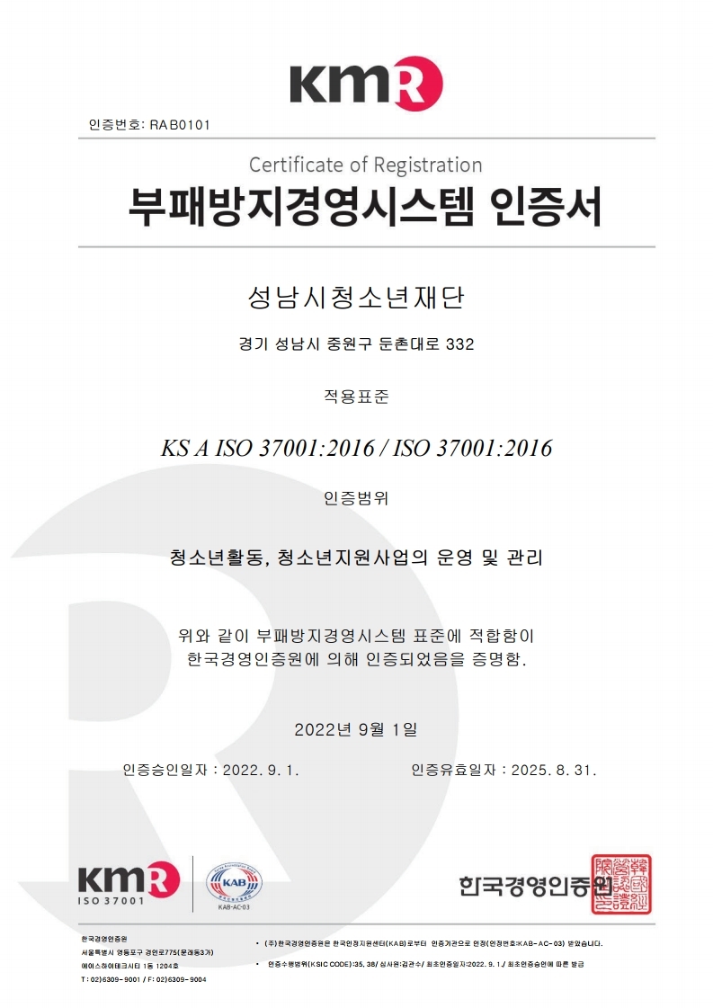 2022. 9. 1.자로 성남시청소년재단은 국제표준 부패방지경영시스템(ISO 37001) 인증을 획득하였습니다.