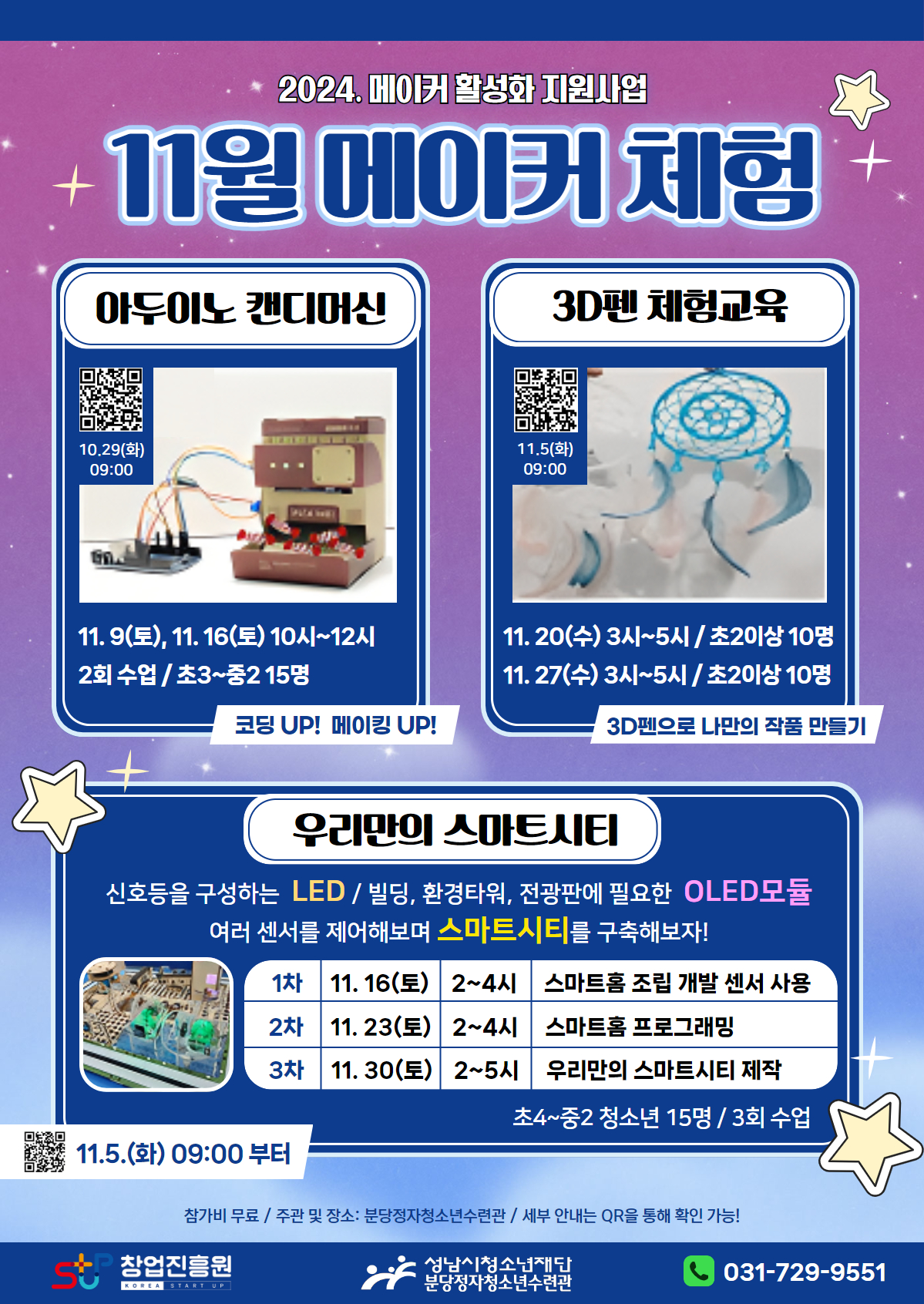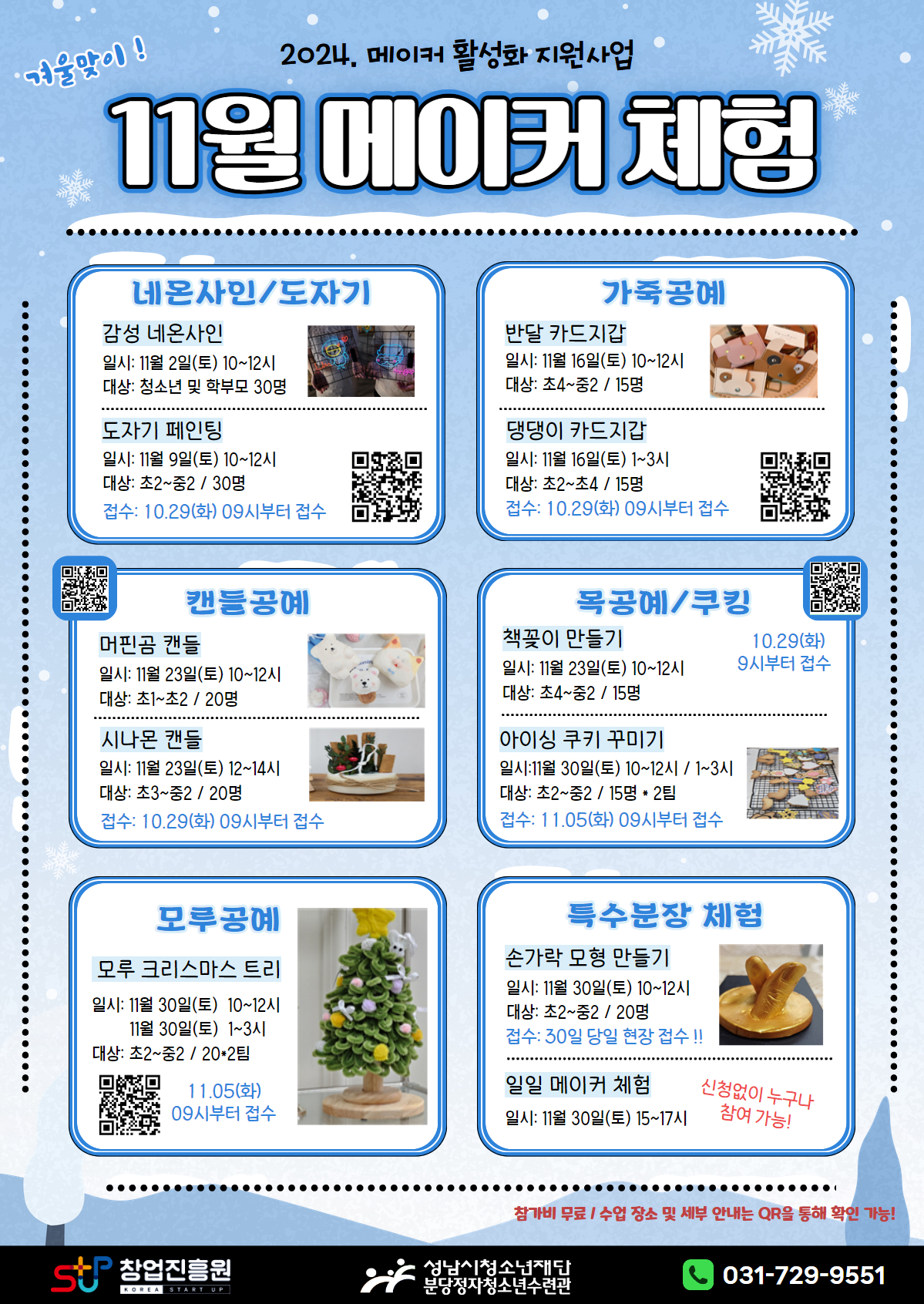 3. 내용: 감성 네온사인, 도자기페인팅, 가죽공예, 목공예, 캔들, 모루트리, 아이싱쿠키, 특수분장, 아두이노 메이킹, 3D펜체험, 스마트홈 등
