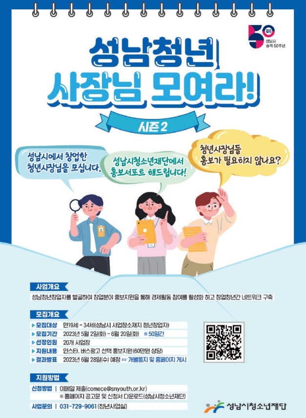 (재)성남시청소년재단에서는 미래변화를 주도하는 성남청년창업자를 발굴하여 지역경제 활성화와 창업자 성장 발판을 위한 홍보지원 및 지속적인 청년정책 공유와 창업자 간 네트워크 활성화를 하고자 참가자 모집을 하오니 많은 관심과 참여 바랍니다.
