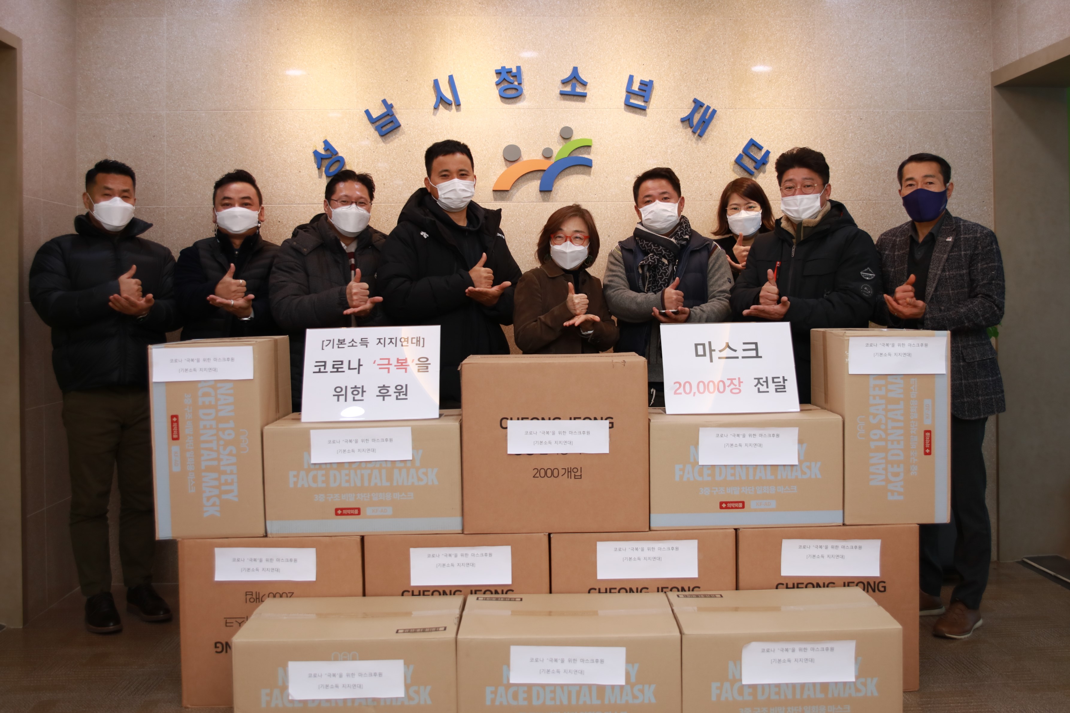 기본소득지지연대가 코로나 위기 극복과 성남시 청소년들의 건강한 생활과 코로나 예방을 위해 성남시청소년재단(대표이사 진미석)에 마스크 20,000장을 전달했다.
