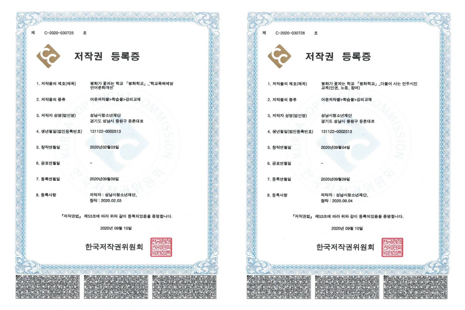 (20.09.22) 성남시청소년재단 ‘평화학교’, 저작권으로 인정받다