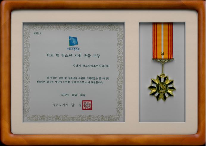 학교 밖 청소년 지원 유공 표창(성남시 학교밖청소년지원센터) 작성자 : 김호규 등록일자 : 2017년 3월 30일 10시 39분 33초 조회 : 2,225 1. 수상명 : 학교 밖 청소년 지원 유공 표창 2. 수상일 : 2016. 12. 28. 3. 주 관 : 경기도 thumbnail.jpg [ Size : 46.1KB , Down : 116 ] 썸네일 이미지 미리보기 다운로드 목록으로