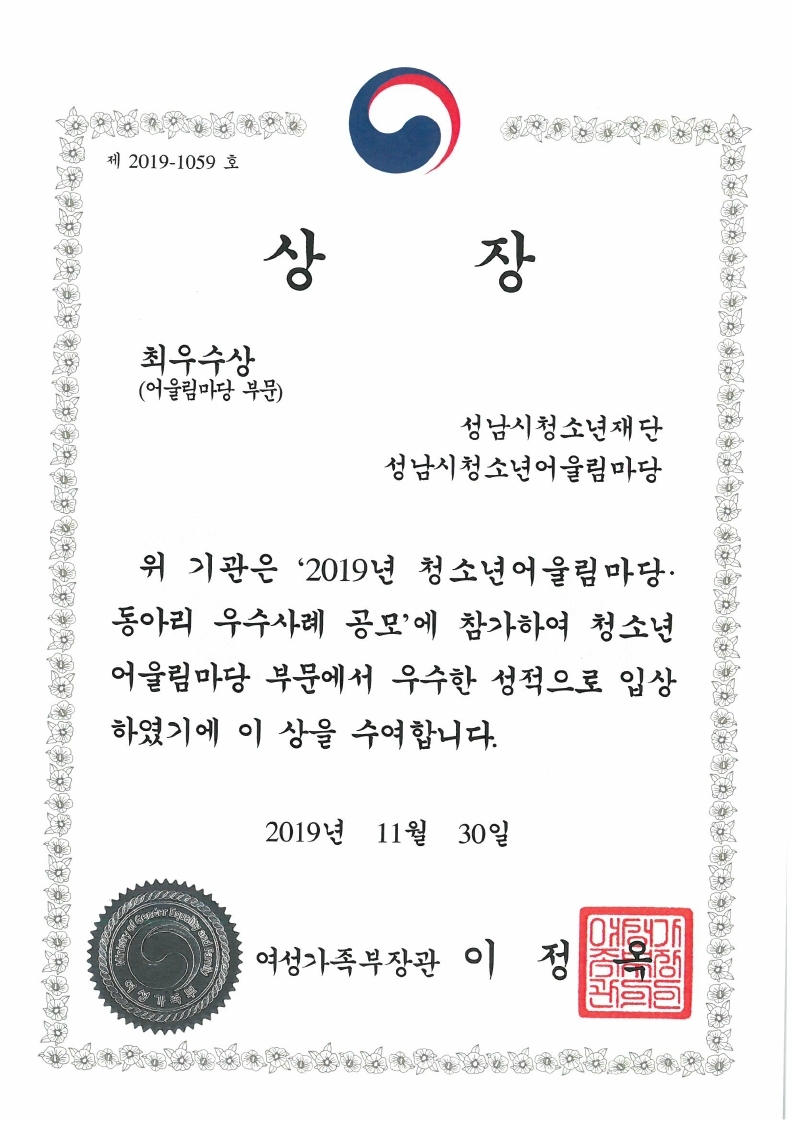 2019 청소년어울림마당 최우수상(성남시청소년재단) 작성자 : 홍보담당 등록일자 : 2020년 6월 29일 13시 52분 31초 조회 : 596 1. 수상명: 2019 청소년 어울림마당 우수사례공모 최우수상 2. 수상일: 2019. 11. 30. 3. 주 관: 여성가족부 thumbnail.jpg [ Size : 319.35KB , Down : 194 ] 썸네일 이미지 미리보기 다운로드 목록으로