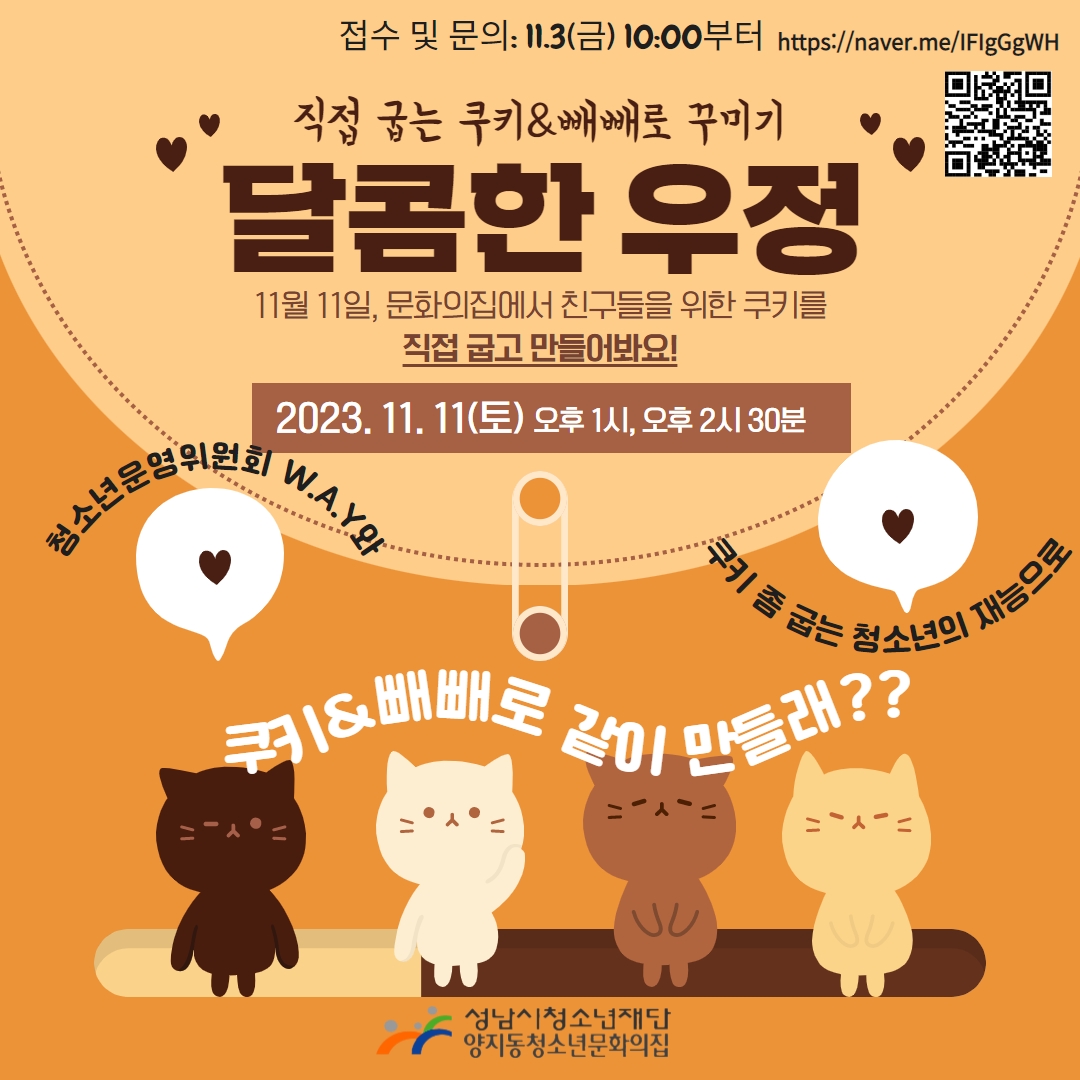 성남시청소년재단 양지동청소년문화의집에서는 청소년운영위원회 W.A.Y.가 기획하여 11 지역 청소년들을 위해 쿠키와 빼빼로를 직접 만들어보는달콤한 우정행사를 다음과 같이 진행합니다.