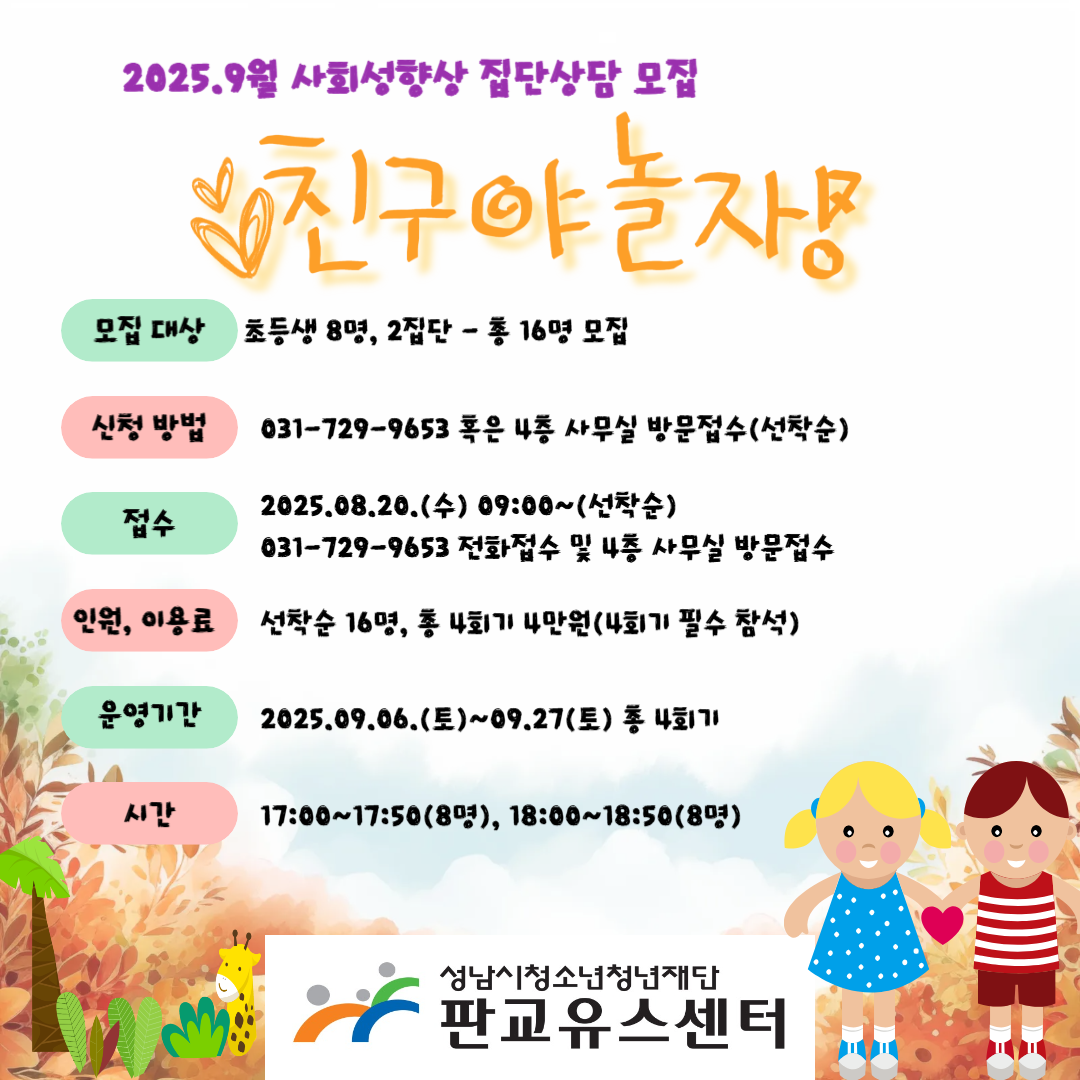 판교유스센터 9월 <친구야 놀자!> 프로그램 접수 안내