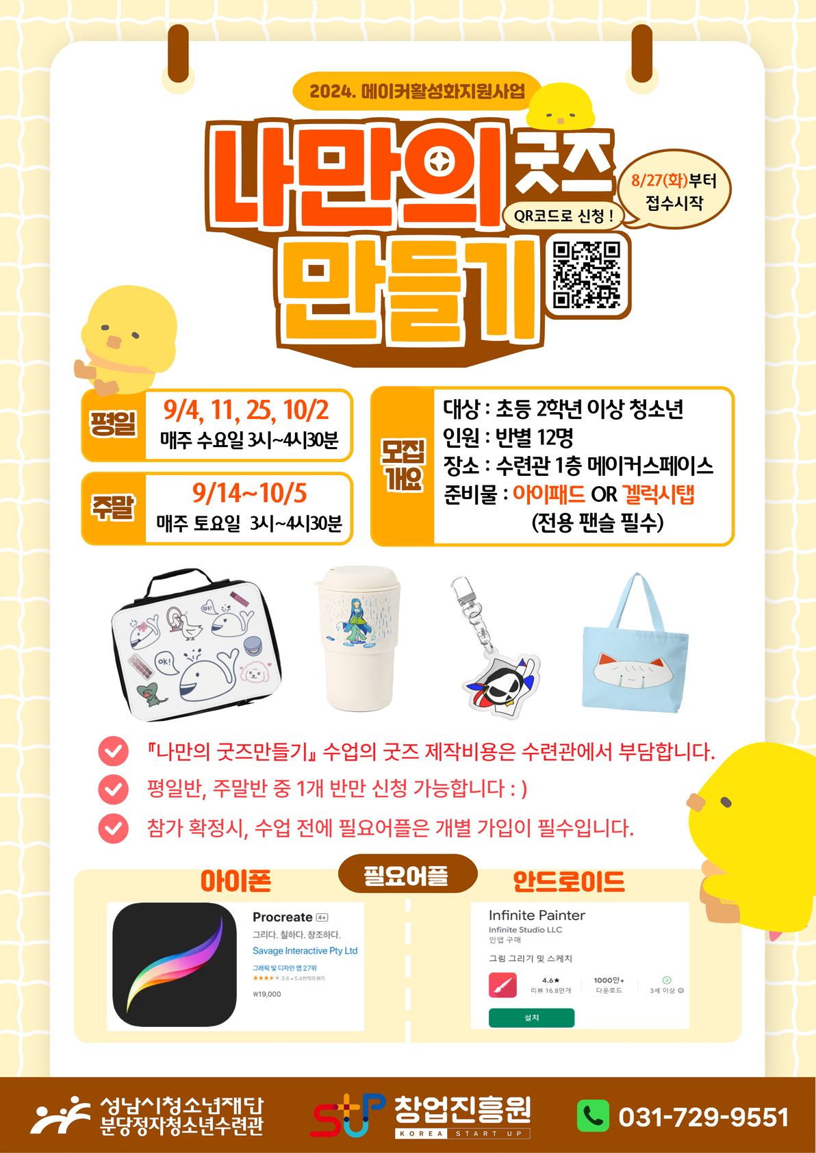 디자인메이커 『굿즈 만들기』 | 9/4, 11, 25, 10/2 (수) 15:00 ~ 16:30 | 초2 이상 청소년 | 12명 | 8. 27(화)부터 QR접수 (무료) | - 태블릿으로 그림그리는 방법을 배우기 - 나만의 굿즈를 직접 만들어보는 활동 - 캔버스백, 스티커 등을 나만의 디자인으로 제작 | 개인태블릿, 전용팬슬 지참 (미술앱 설치 필수) |