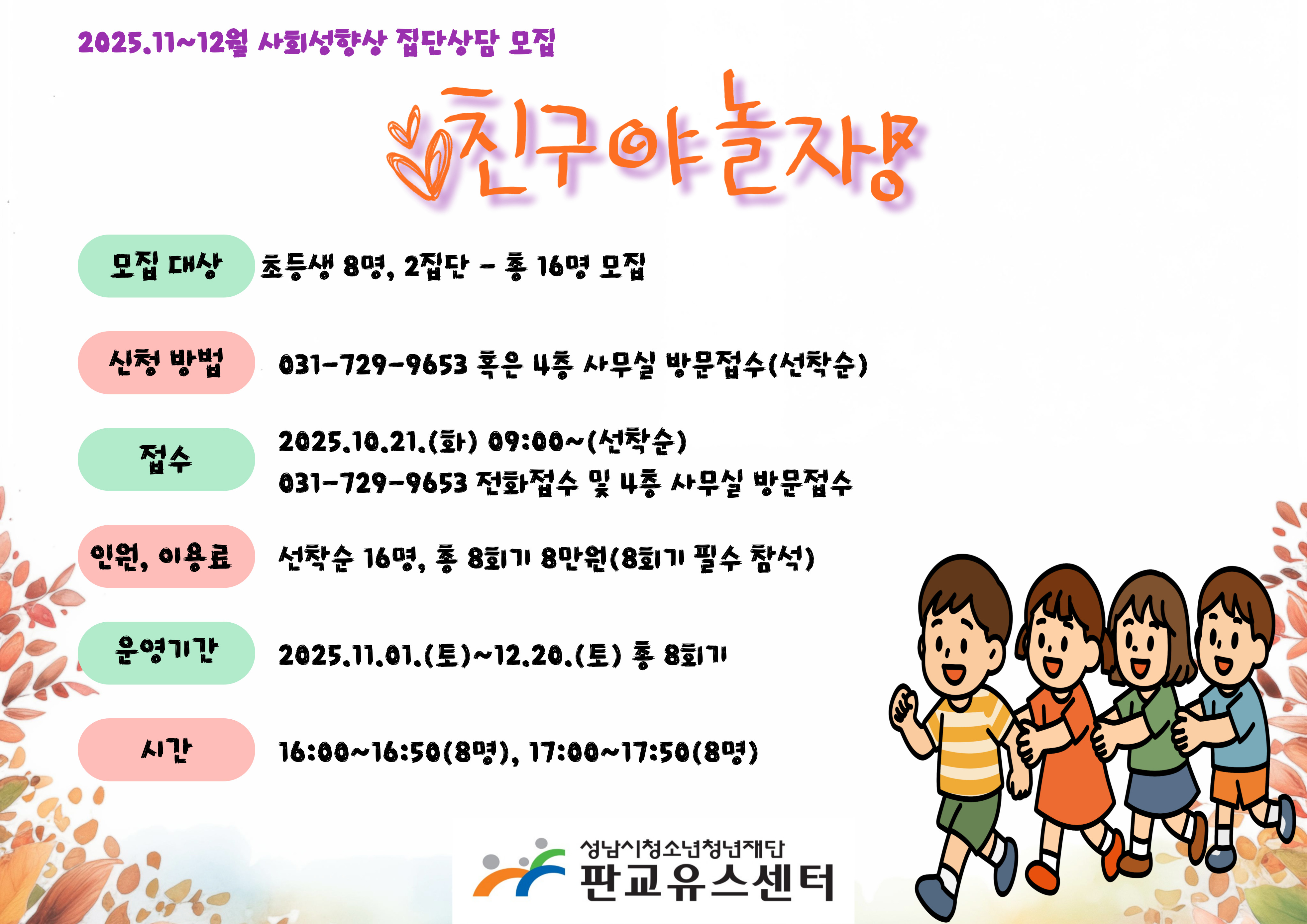 판교유스센터 11~12월 <친구야 놀자!> 프로그램 접수 안내